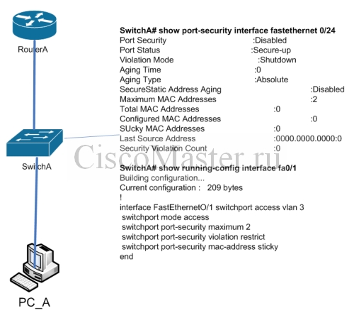 Refer to the exhibit. A junior network administrator was given the task of configuring port security on SwitchA to allow only PC_A to access the switched network through port faO/1. If any other device is detected, the port is to drop frames from this device. The administrator configured the interface and tested it with successful pings from PC_A to RouterA, and then observes the output from these two show commands.
